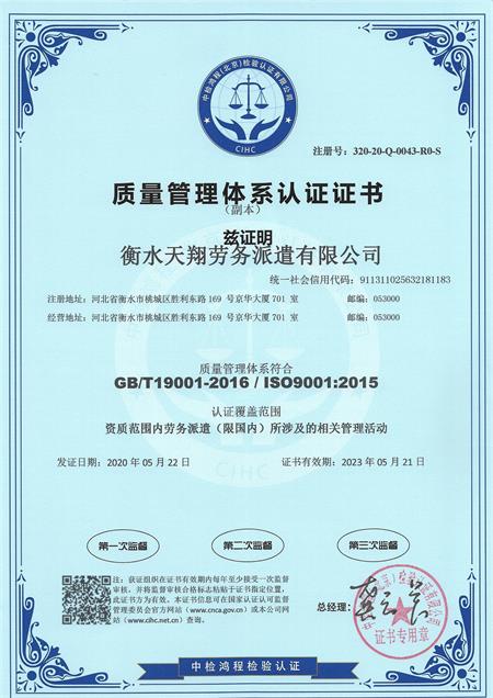 質(zhì)量管理體系認(rèn)證證書